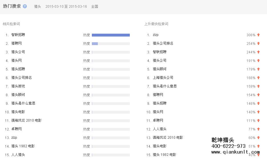 由上圖可以看出,2015-03-10 至 2015-03-16全國范圍內(nèi)有關(guān)關(guān)鍵詞獵頭的相關(guān)檢索詞前十五名分別為: